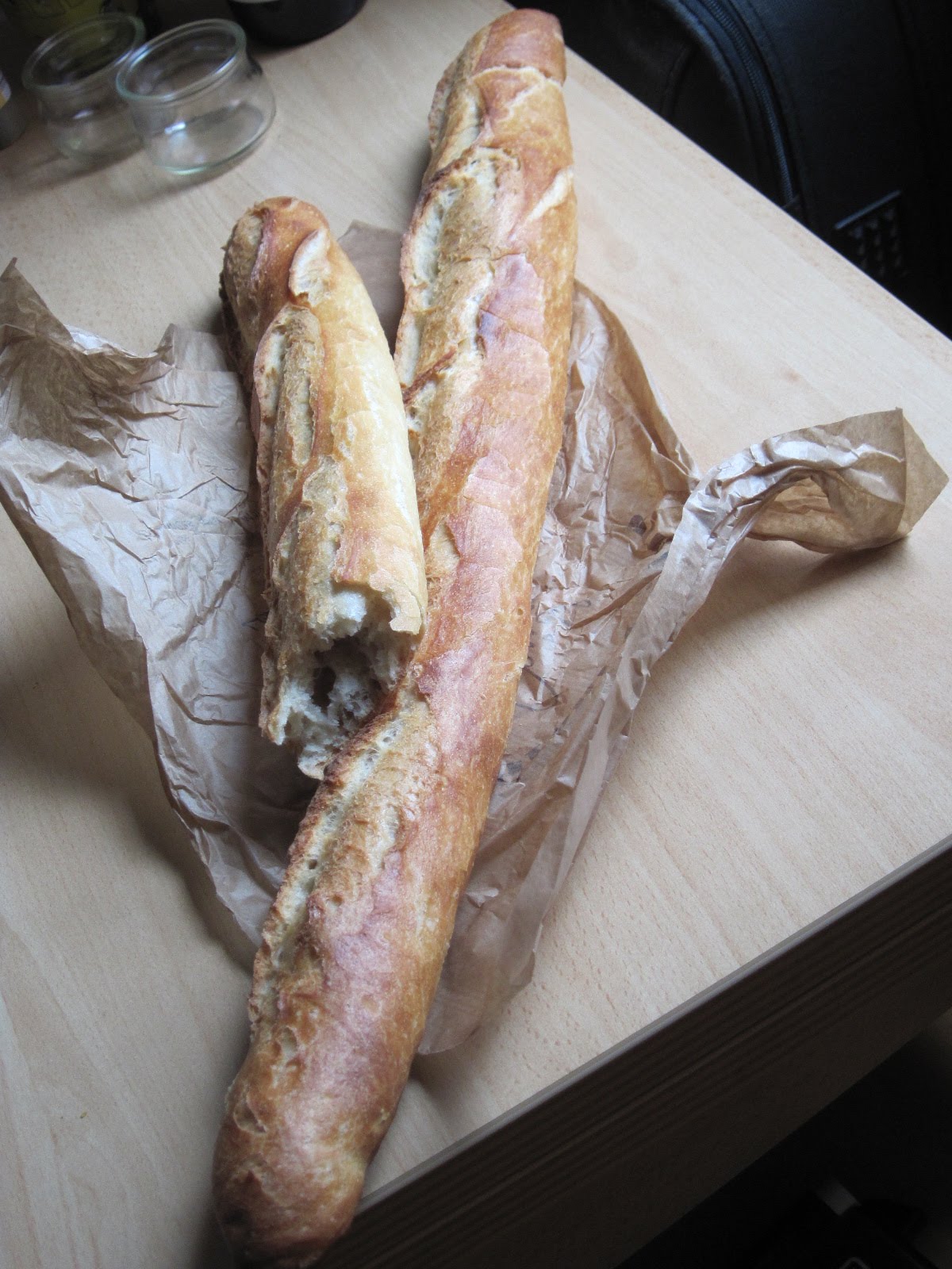Since Passover is quickly approaching (it starts Monday at sundown!) The husband and I decided to end on a positive note-with Paris' best baguette, the winner of "le Grand Prix de la baguette" 2010. We took the train 20 minutes early Sunday morning to Le Grenier à Pain near Métro Abesses (near Montmartre) which happens to be the stop deepest underground in the Paris transport system. Many stairs later and a few blocks walk past throngs of people selling laurel/palm for Palm Sunday, we reached the promissed land, also known as 38, rue des Abesses in the 18e. We bought two of boulanger Djibril Bodian's delicious baguettes, only 1.5 of which made it home ;) We couldn't let a warm baguette go to waste, now could we?